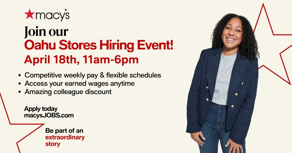 Macy’s Ala Moana Center is hosting a hiring event on Saturday, April 18th from 11am–6pm at 1450 Moana Boulevard – Suite 1300 Honolulu, HI 96814. Connect with our teams from Ala Moana, Kapolei, Pearlridge, Kahala, and Waikiki and explore Full Time and Part Time Sales and Beauty opportunities. Make your way to the second floor (mall level) near the escalator across from the Fine Jewelry Department. Our team will be there to greet you, check you in, and guide you to our Executive Offices.