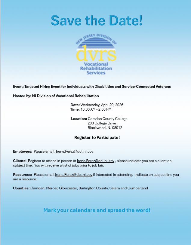 We are very excited to invite you to a ” Targeted Hiring Event for Individuals with Disabilities and Service-Connected Veterans” hosted by NJ Division of Vocational Rehabilitation.